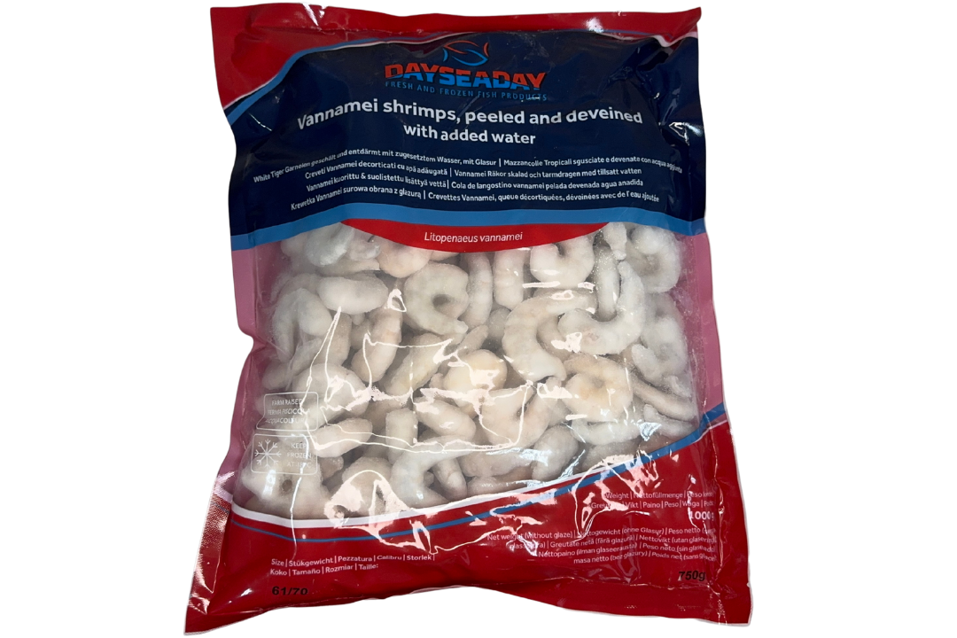 Mrożone krewetki białe (Litopenaeus Vannamei), surowe, w pełni obrane i oczyszczone (IQF). Rozmiar 61/70 szt/lbs (134-154 sztuk w paczce). Opakowanie 1 kg (750g netto). Produkt akwakultury z Wietnamu. Idealne do dań, gdzie liczy się mniejszy rozmiar krewetek.