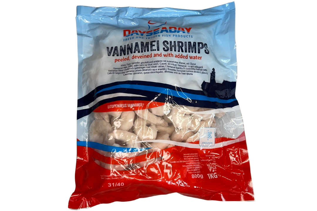 Mrożone krewetki białe (Litopenaeus Vannamei), w pełni obrane i oczyszczone (IQF). Rozmiar 31/40 szt/lbs. Opakowanie 1 kg (800g netto). Idealne do smażenia, gotowania i dań azjatyckich.
