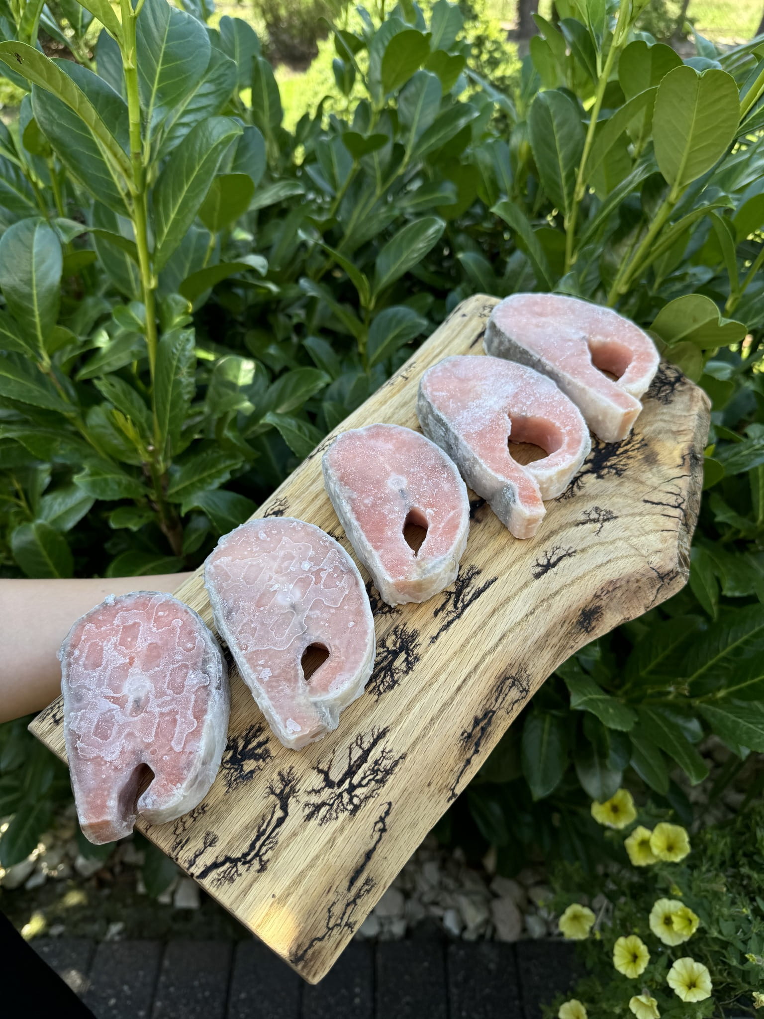 Prezentujemy Steki/Dzwonki z Dzikiego Łososia Pacyficznego (Oncorhynchus keta), ryby poławianej w czystych wodach Północnego Pacyfiku (USA). Ten szlachetny łosoś charakteryzuje się intensywną, naturalną barwą i wyjątkowym smakiem. Steki, o idealnej porcjowanej gramaturze ok. 250 g/szt., mrożone są metodą szokową IQF, co minimalizuje utratę wartości. Steki posiadają minimalną glazurę ochronną w wysokości 10%. Oznacza to, że z 3 kg brutto otrzymujesz 2,70 kg czystego mięsa z łososia. Produkt jest bez dodatków chemicznych.